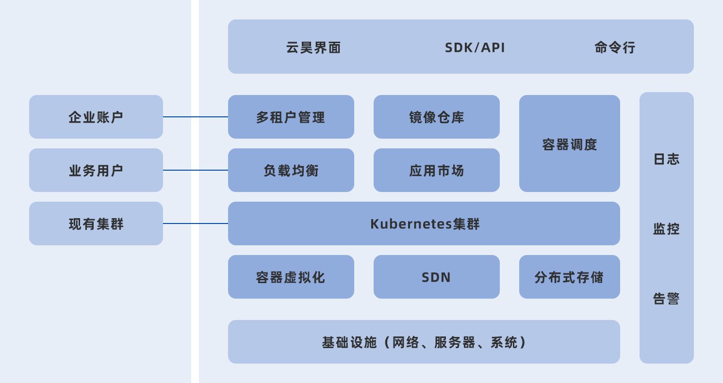 云昊平臺是光大科技研發的容器云PaaS平臺。支持高可用集群一鍵部署、海量容器秒級啟動、租戶資源安全隔離等功能;提供自定義鏡像管理、應用負載均衡、數據安全可靠存儲、服務編排與部署、日志告警等服務;提升業務運維便捷度,資源利用率及部署迭代效率。